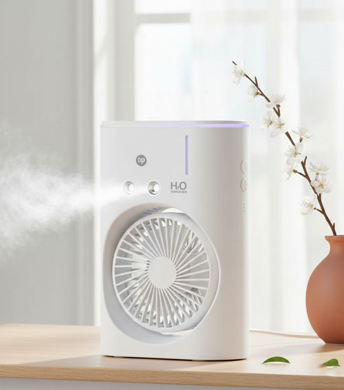 Beat the heat and the dry air with the DP 7688 Portable Desk Fan and Humidifier. This clever 2-in-1 rechargeable misting fan combines a powerful breeze with a soothing cool mist, making it the ultimate personal air cooler for your workspace or bedside.